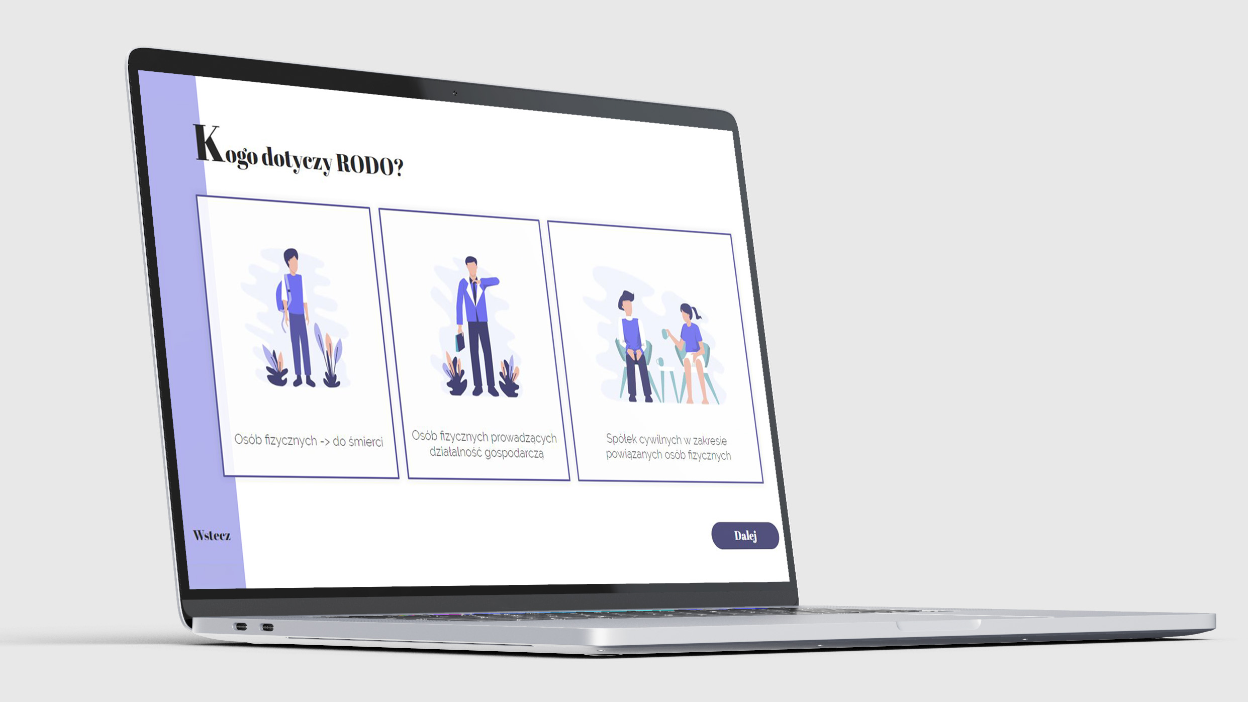 Paleta kolorystyczna w szkoleniu jest minimalistyczna, głównie są to fiolety oraz czerń i biel.