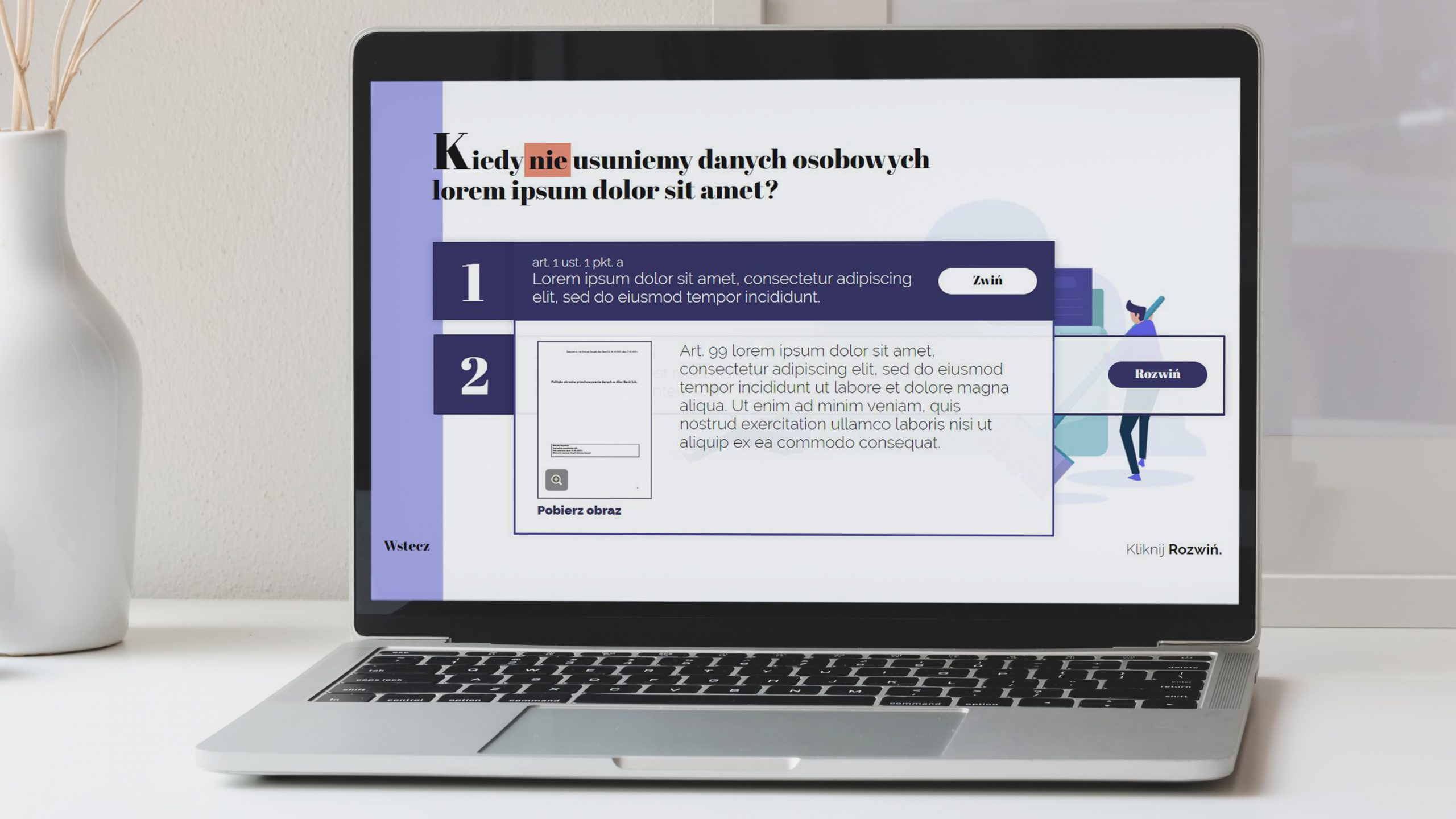 Ciekawym zabiegiem wizualnym jest fioletowy pasek przy lewej krawędzi ekranu. Treści delikatnie zachodzą na niego, niejako „wychodząc” z białego tła. Sprawia to, że układ jest bardziej dynamiczny i przestrzenny.